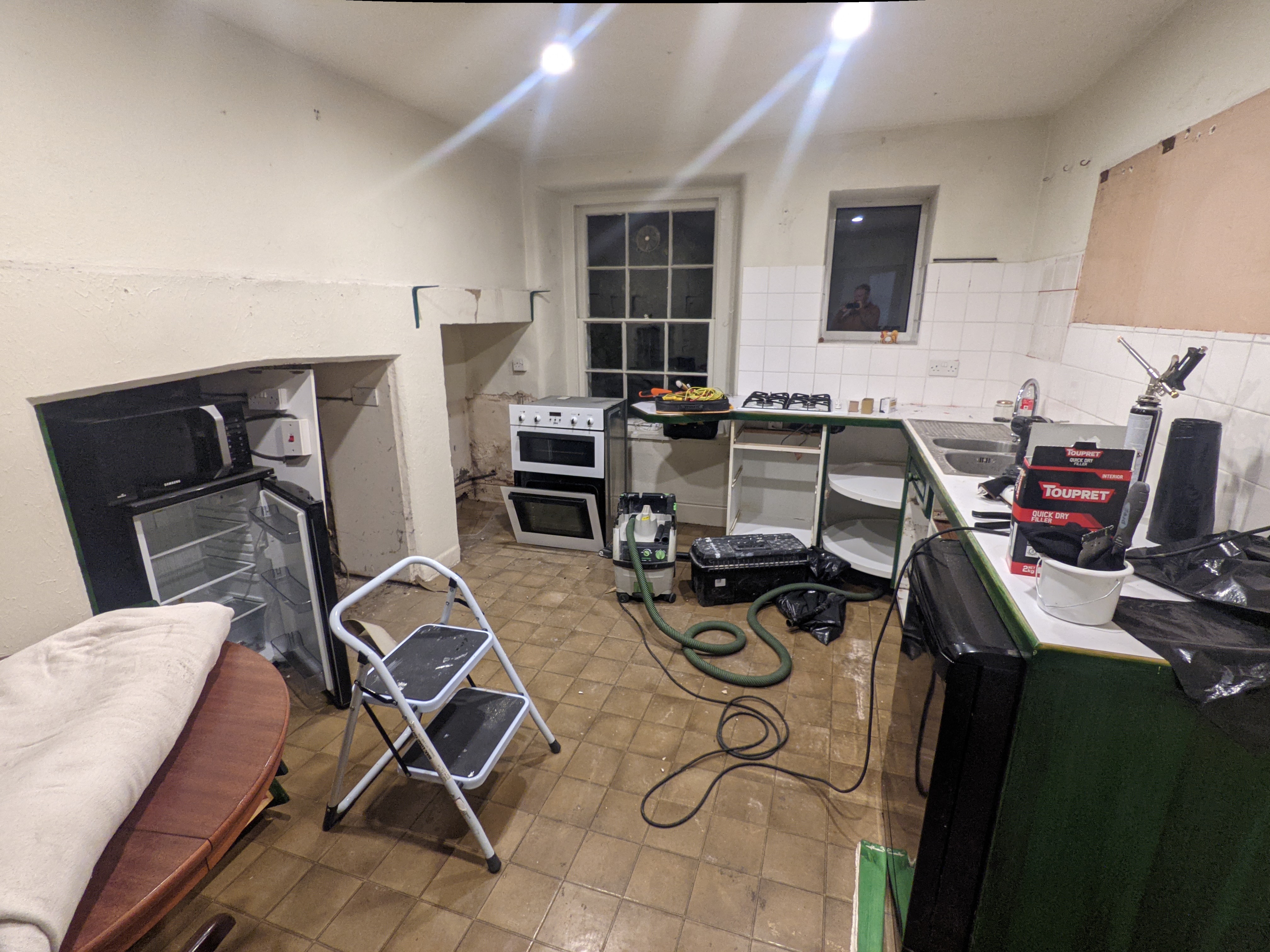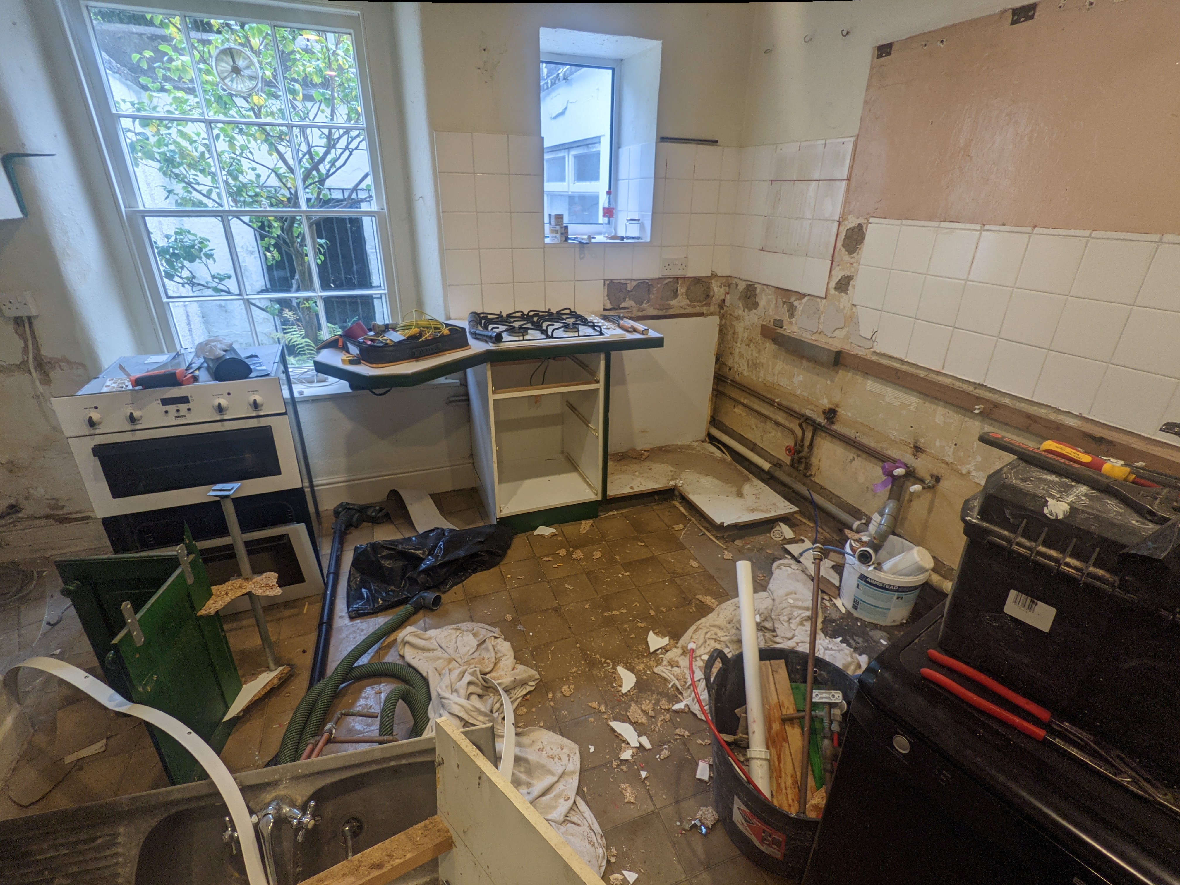 Over the course of the next few days we found three more joints that were leaking. The mains water in the tool cupboard, the new bathroom sink tap, and the hot water in the new kitchen. Only one of these could be blamed on the plumber, but still. Argh!