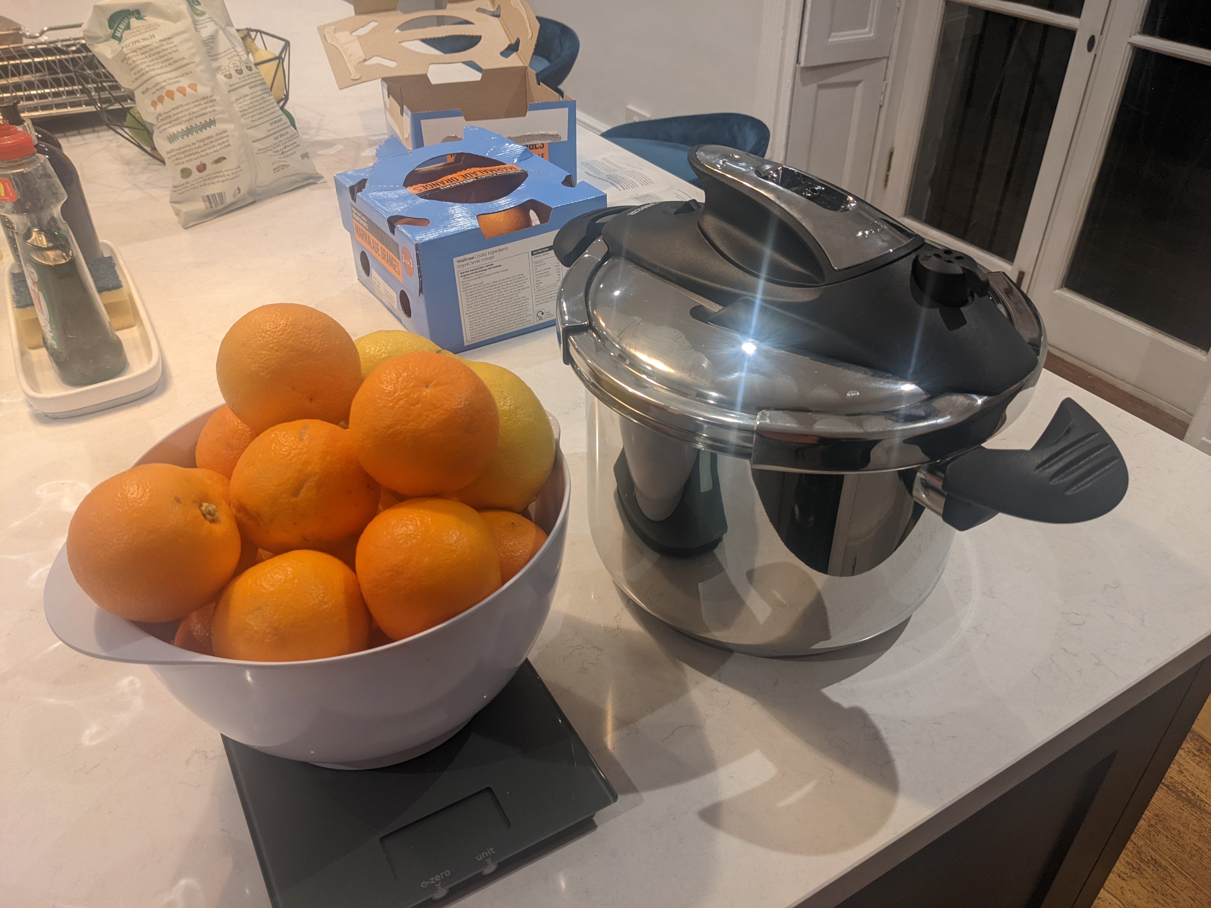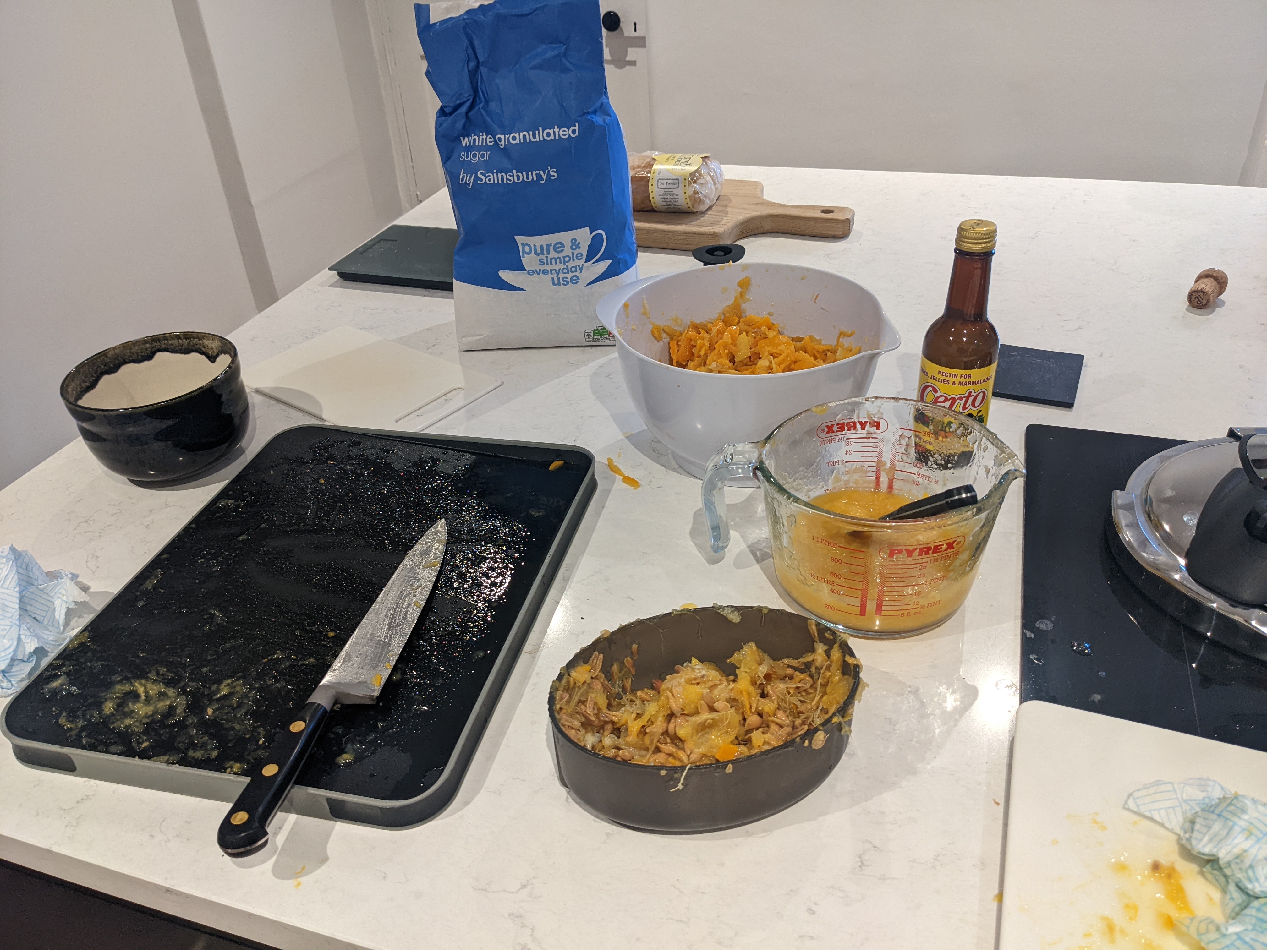 We spent a surprisingly arduous afternoon making marmalade from Ozzy's granddad's recipe! Even with slightly higher worktops than normal, it's still a back-achingly tiresome process to remove all the pith and pips from 2kg of Seville oranges.