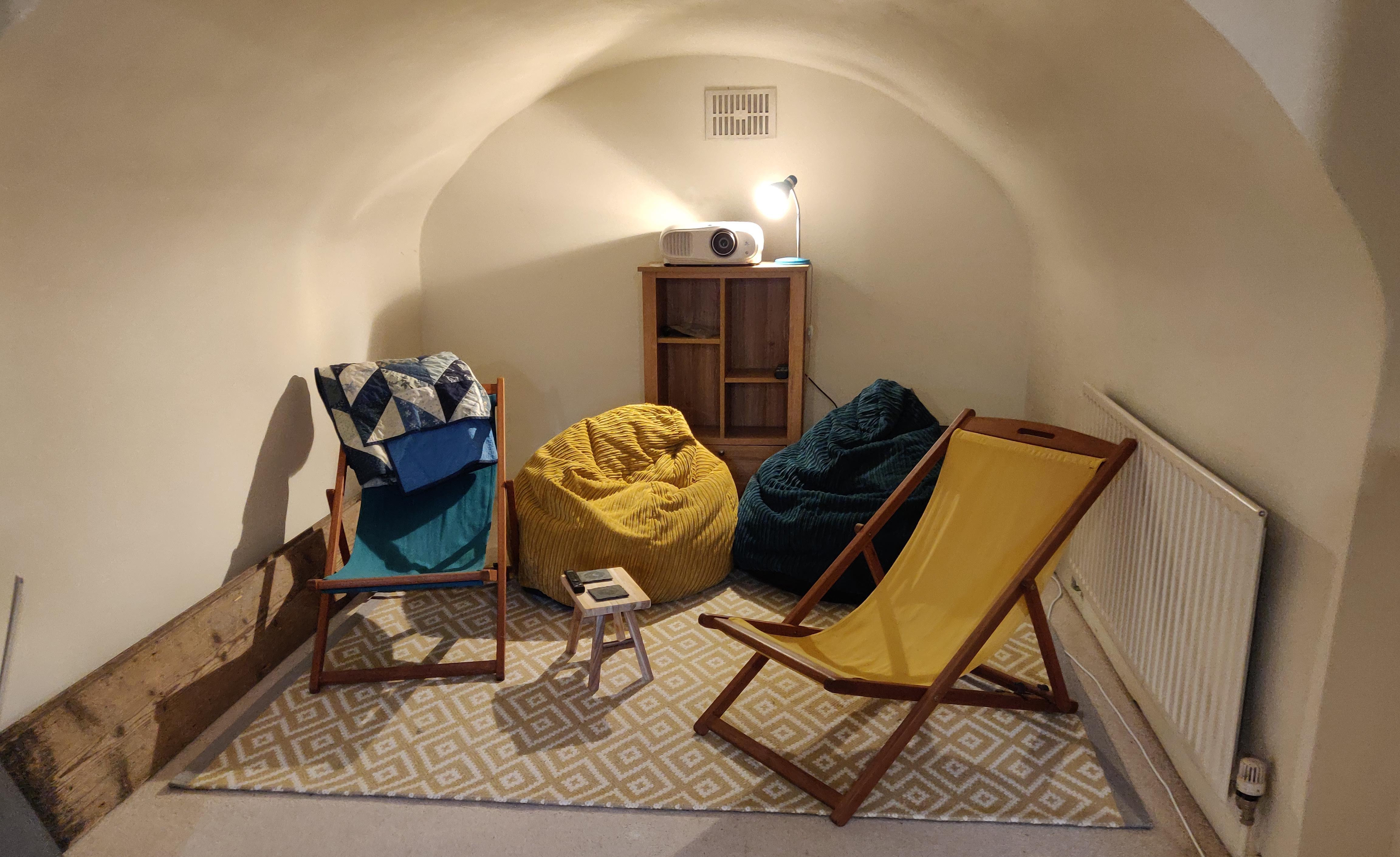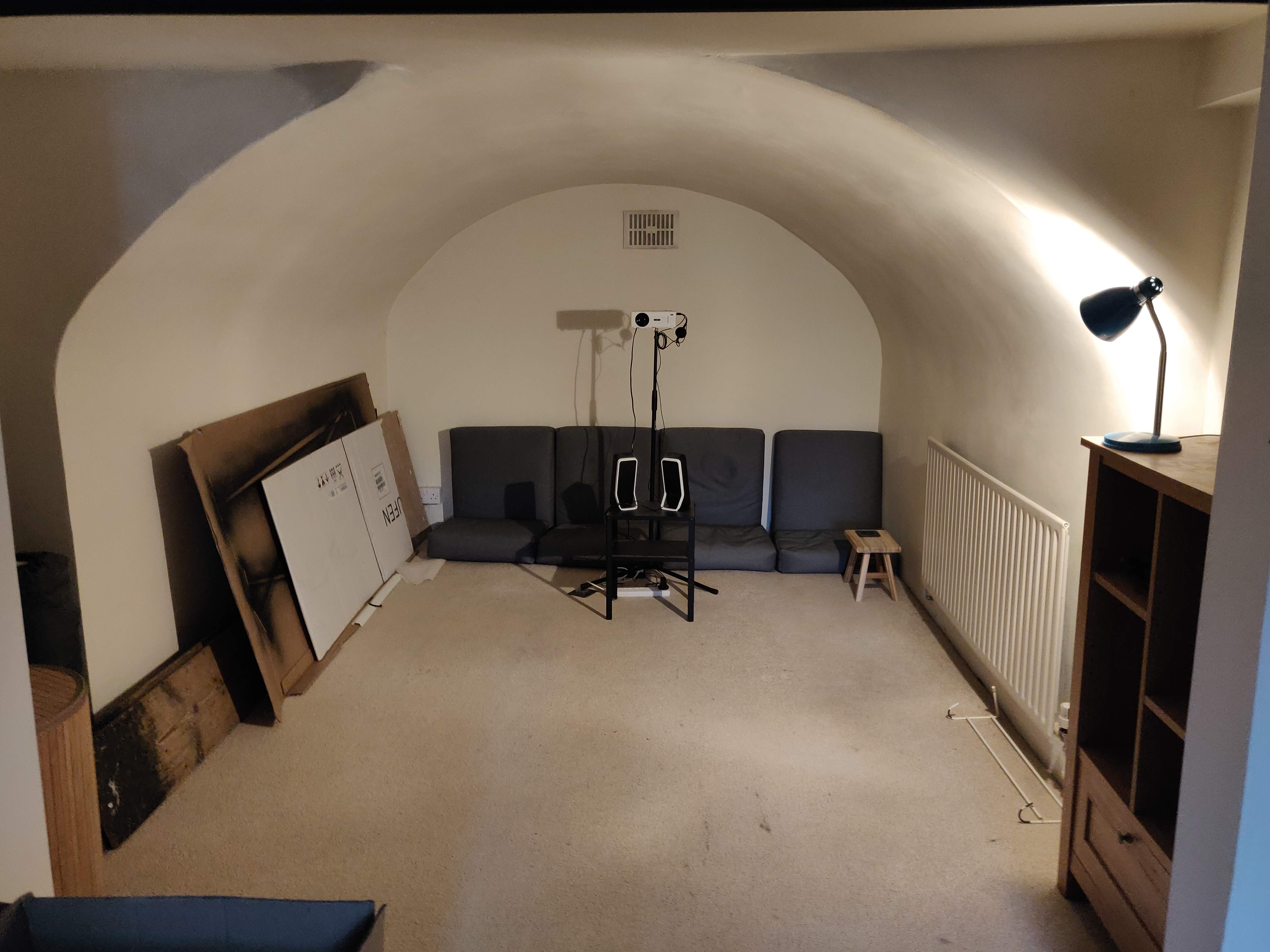 The cinema is a lot nicer than it was. We upgraded the seating when Ozzy bought some beanbags as a birthday present for Nikki, and we took quite a large step forwards by replacing the projector and getting a soundbar. It's pretty awesome and comfy to watch stuff down there now and we've had several movie nights with films, snacks and friends.