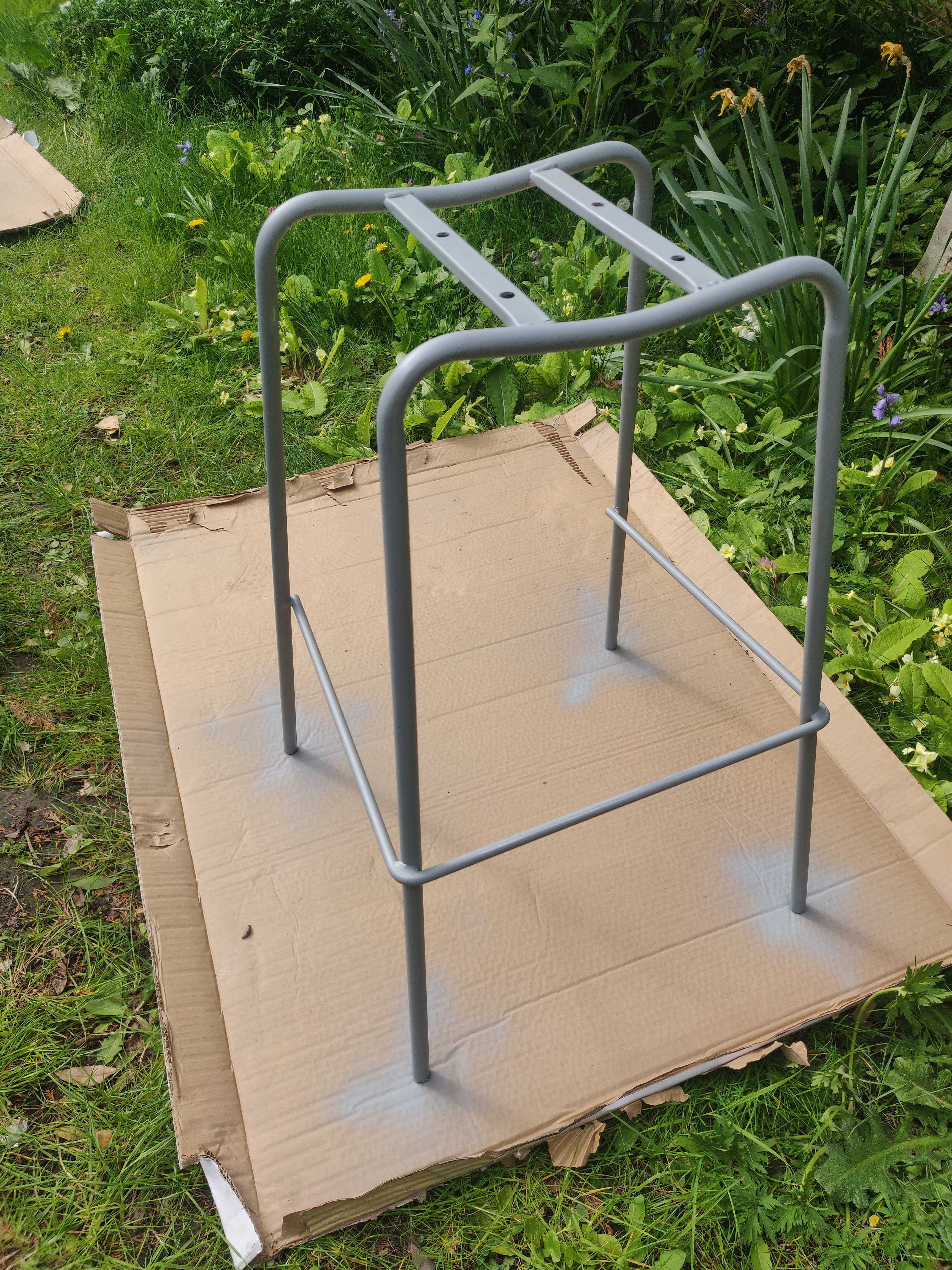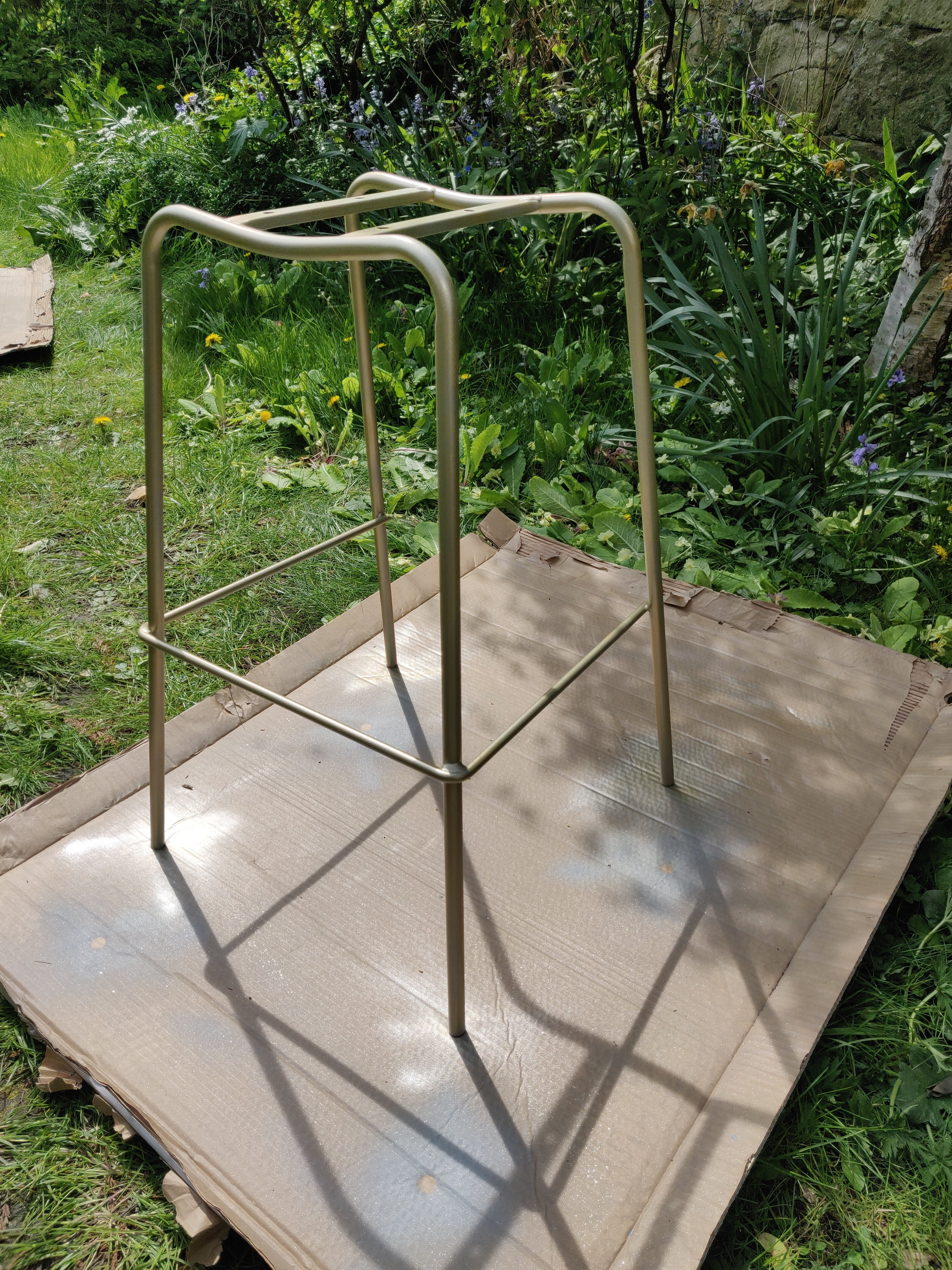 First, she tried a gold spray paint with grey spray undercoat. We went and bought a can that claimed to have sufficient coverage, but we soon found out that trying to spray something as thin as the stool legs results in an awful lot of paint missing the legs, as such we ran out of paint very quickly. What paint hit the legs went on fairly easily, but the result was a bit patchy and the paint looked more like glitter than โจblingโจ. The paint was also prone to scratching, and as a last effort before our kitchen was photographed, she tried a brushable paint.