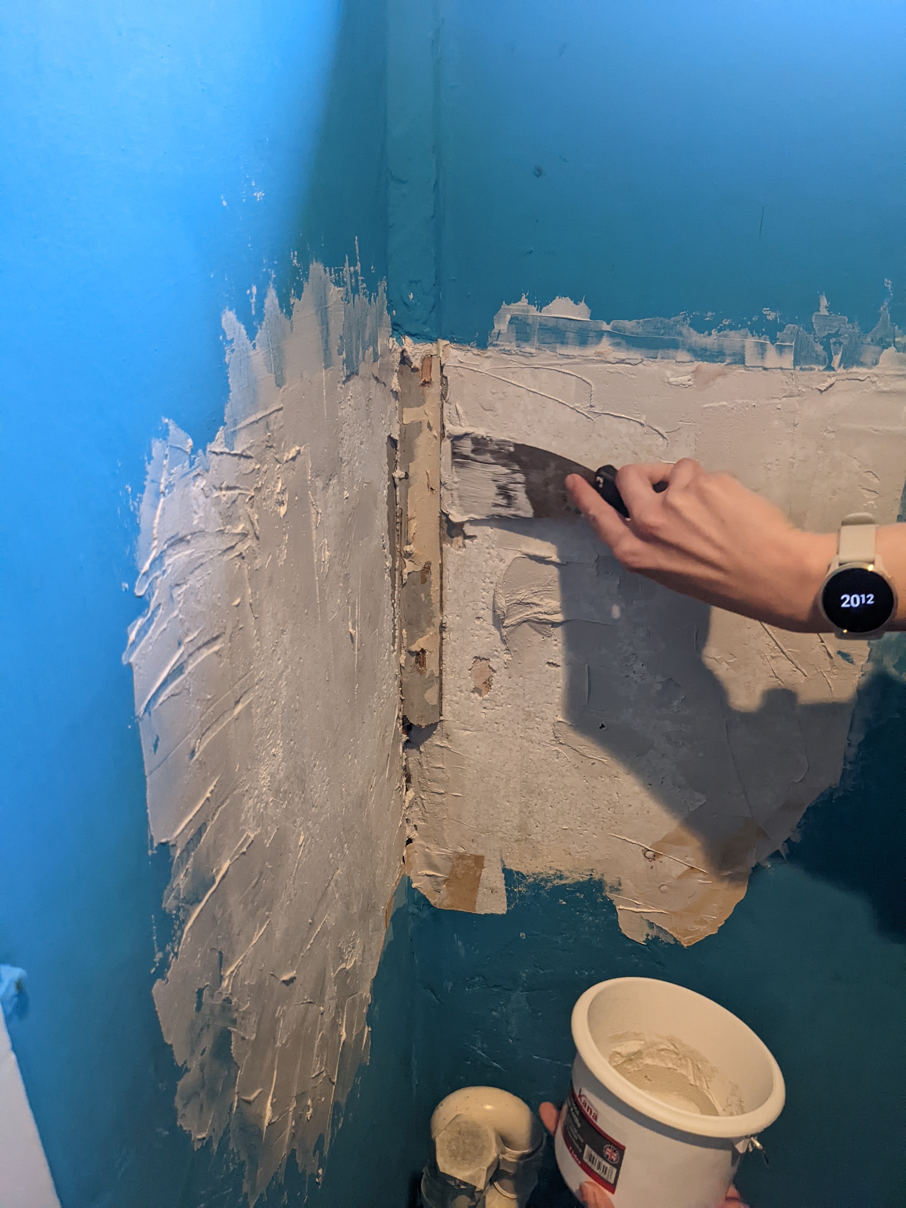 First off, demolition. It was pretty easy to remove the backsplash tiles and sink. The tiles were attached to wallpaper, which was attached to expanded polystyrene, which was not very attached to wall. There was a large amount of polyfillering, sanding, then more polyfillering to do once the old tiles and sink had been ripped out.