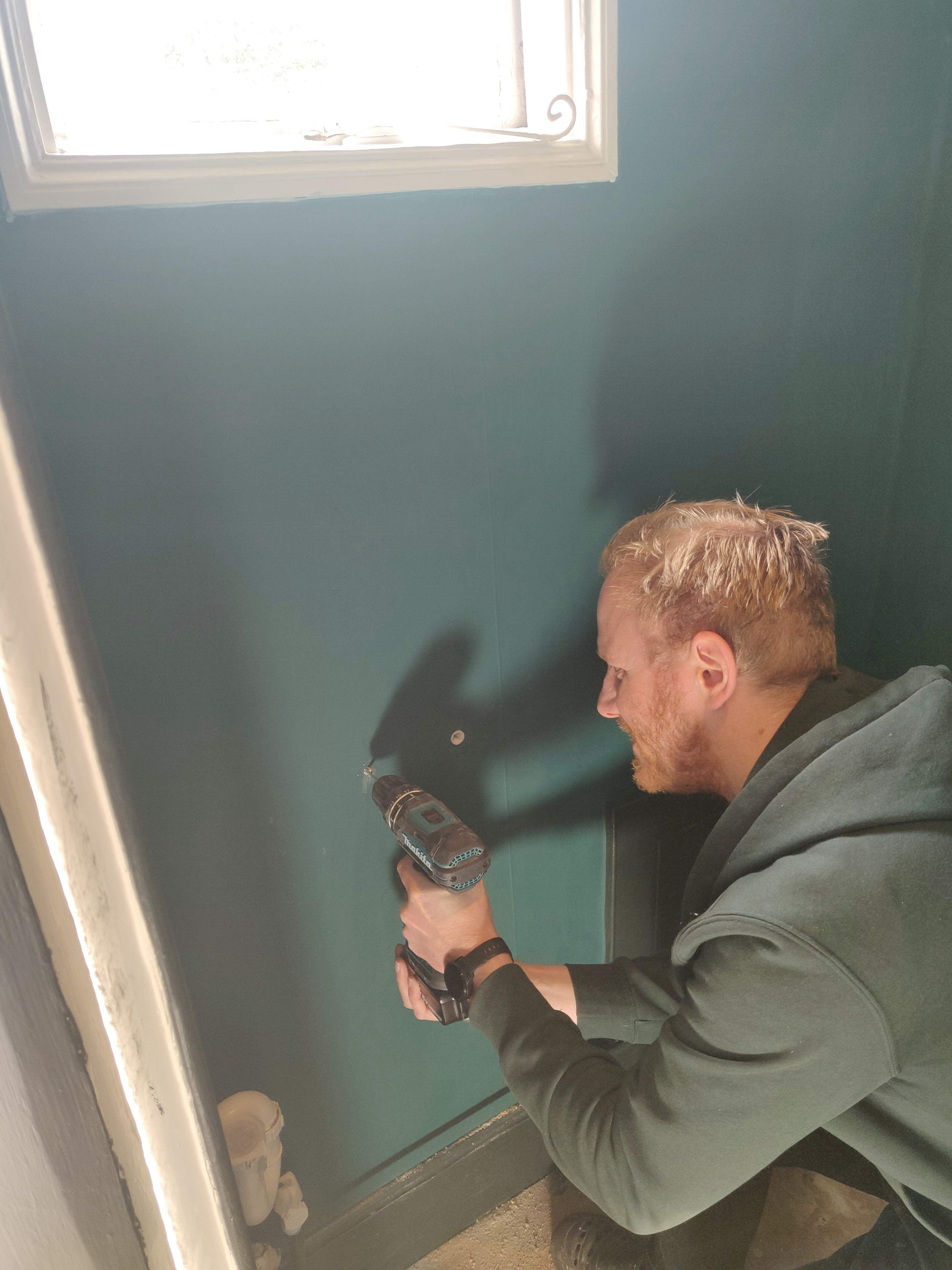 Next, painting. We thought it was fitting that, as the previous colour was leftover blue paint from what our office was, the new colour is the leftover green paints from our bedroom and front door. Clearly it is too small a room for anyone to bother buying new paint! In fact, it was so small a room that Ozzy decided it would be far too crowded for more than one person to do the painting, so Nikki had to do it all (oh no ๐).