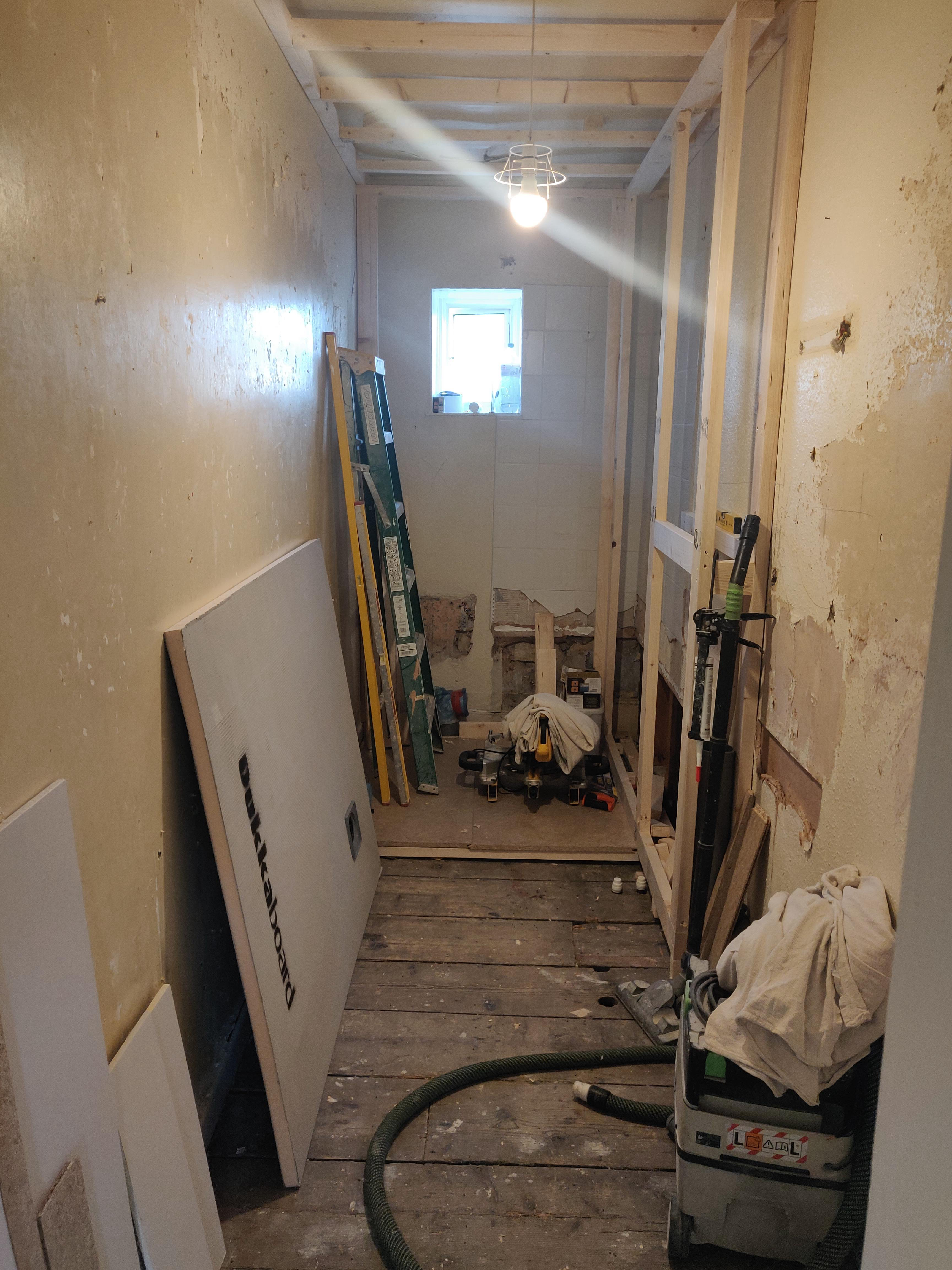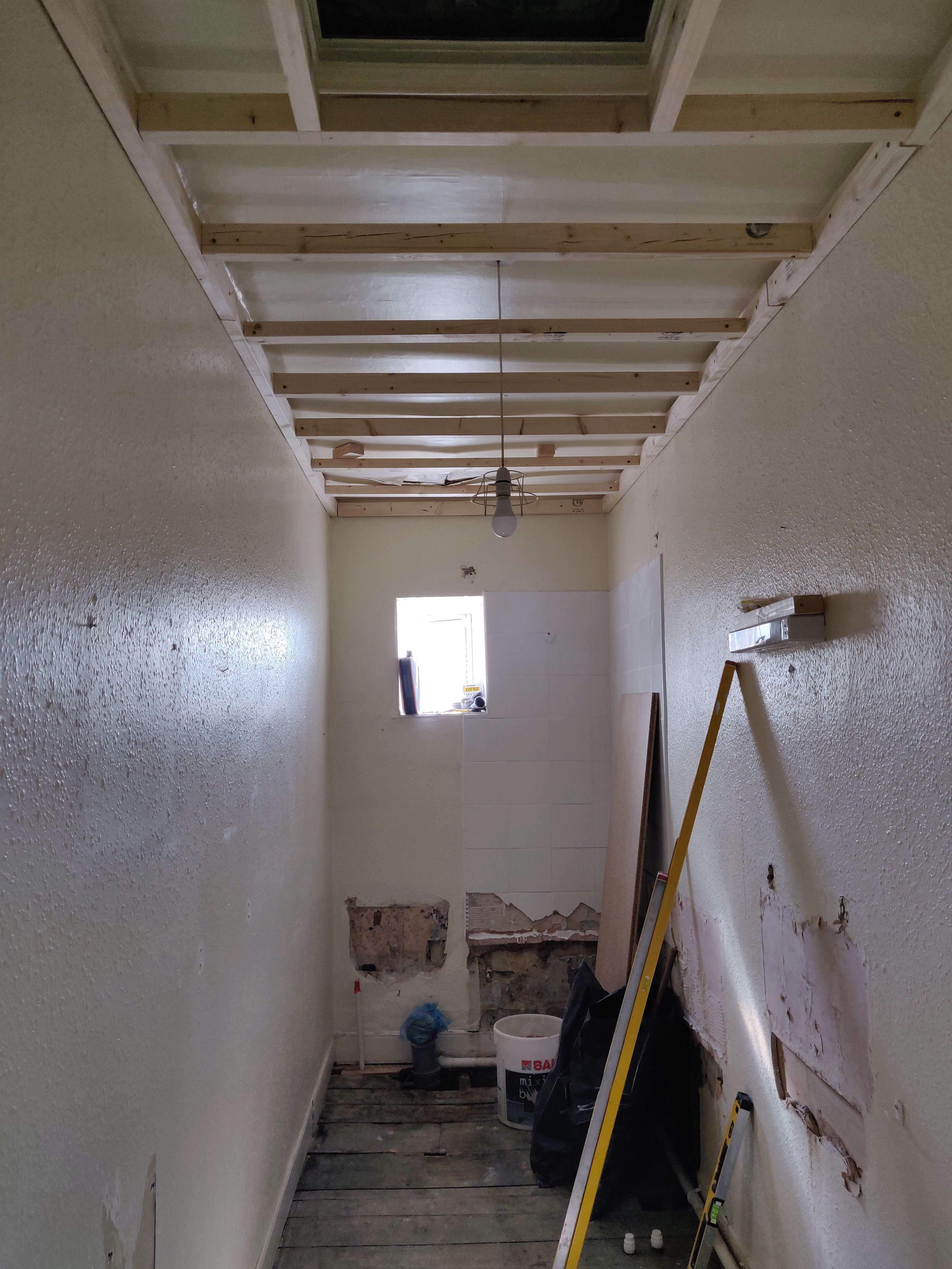 Works have started in the bathroom. With our builder slot being three months long, they are able to take their time and wait for tiles and things to arrive before they are needed.