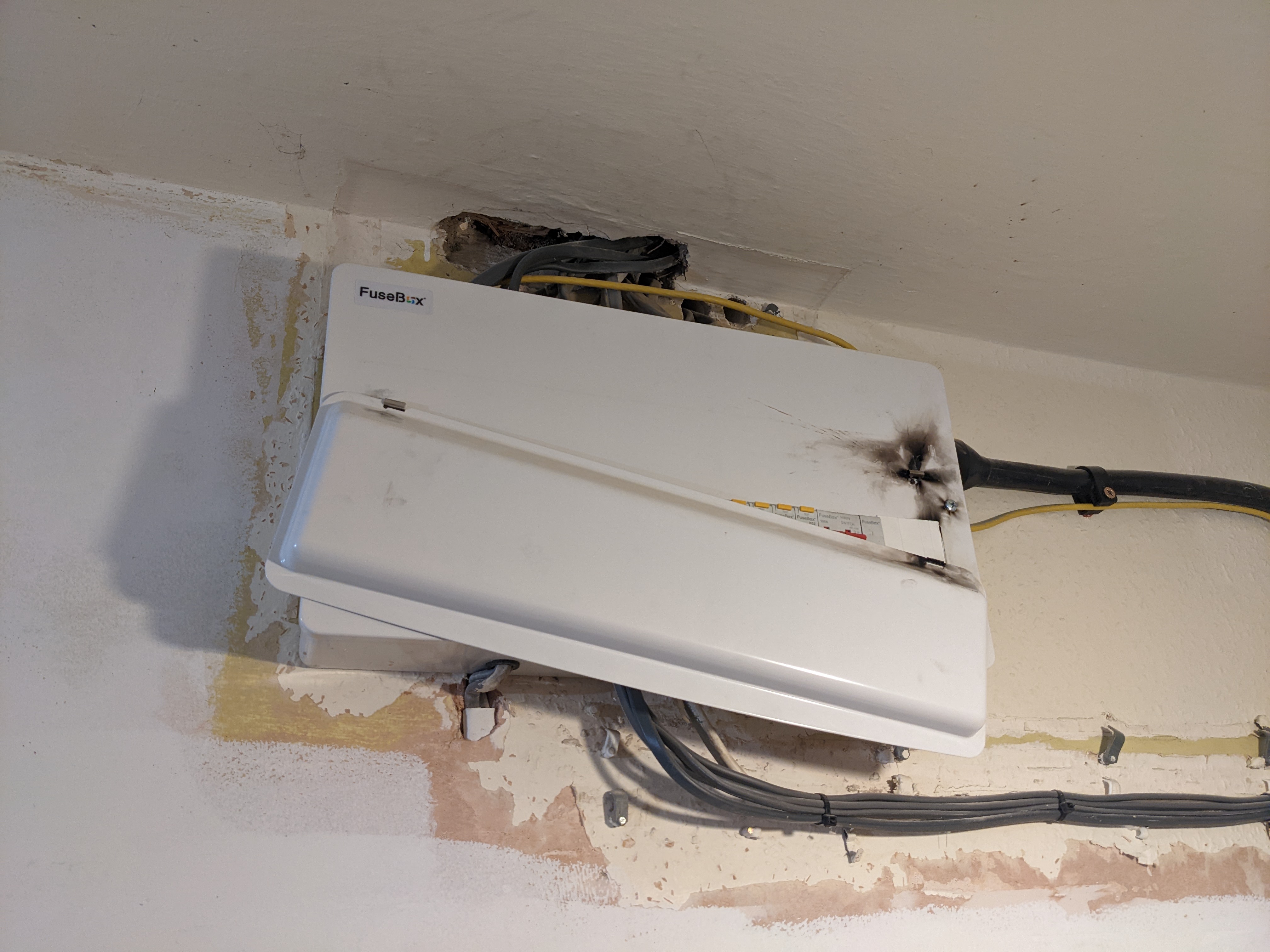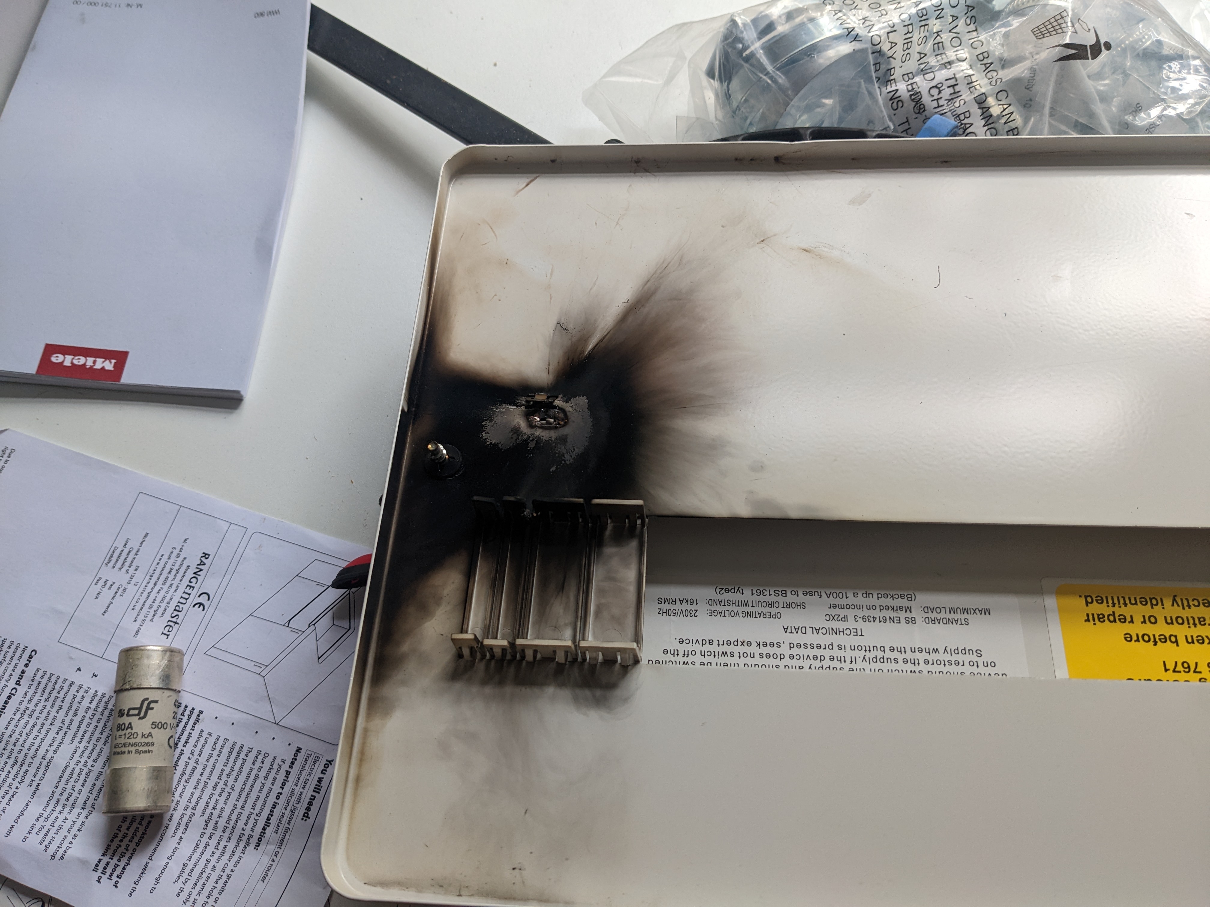 It was pretty dramatic. The 80A whole-house-fuse blew. Rob is pretty annoyed with the unit manufacturers for having such a dangerous hinge design. Especially as the dangerous tabs are right next to captive screws that are blunted to avoid this sort of issue.