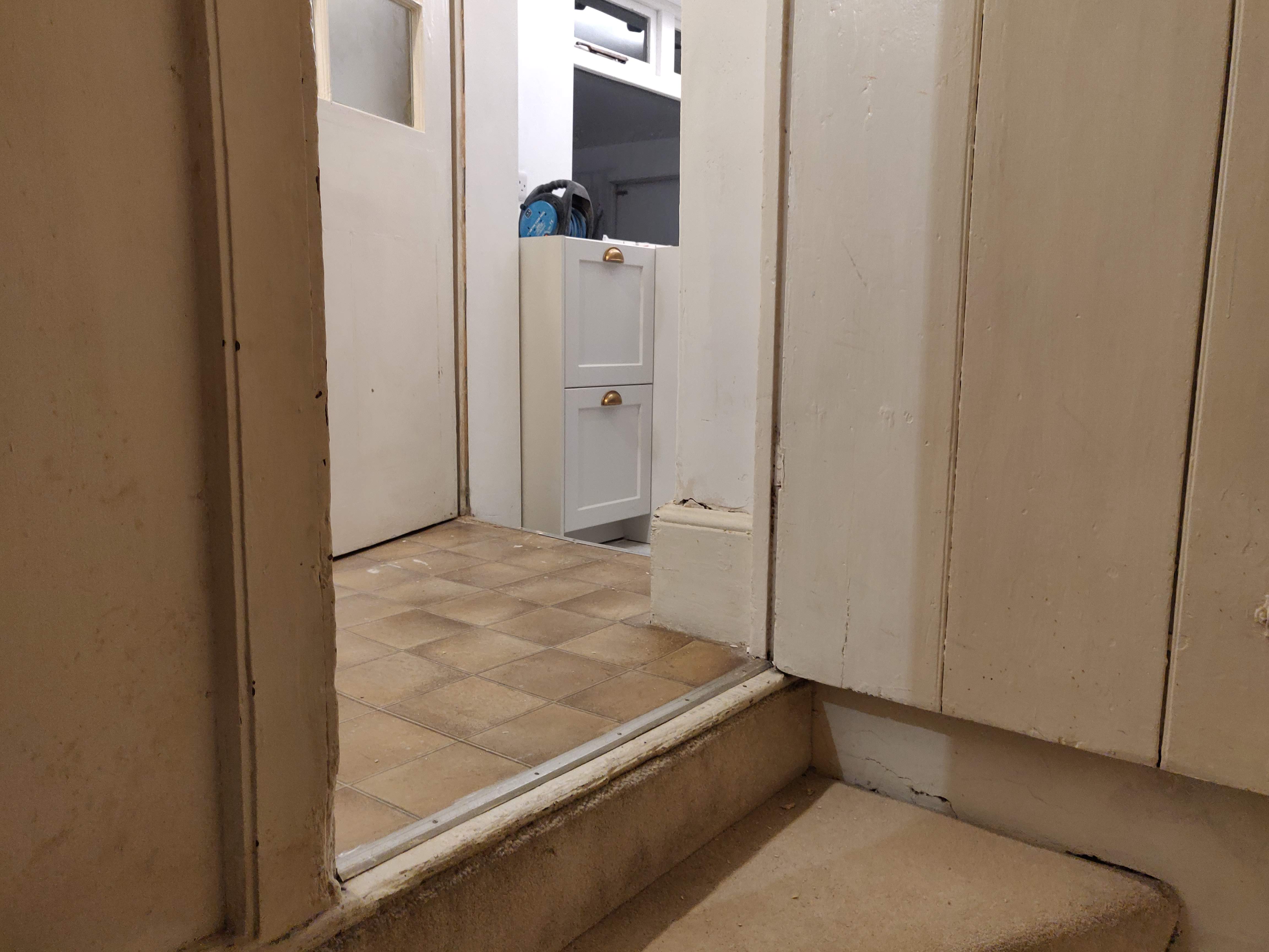 This is arguably the most dramatic change - the hallway has changed from a very bright yellow to a very dark green, by way of a lot of wall filler and white undercoats.