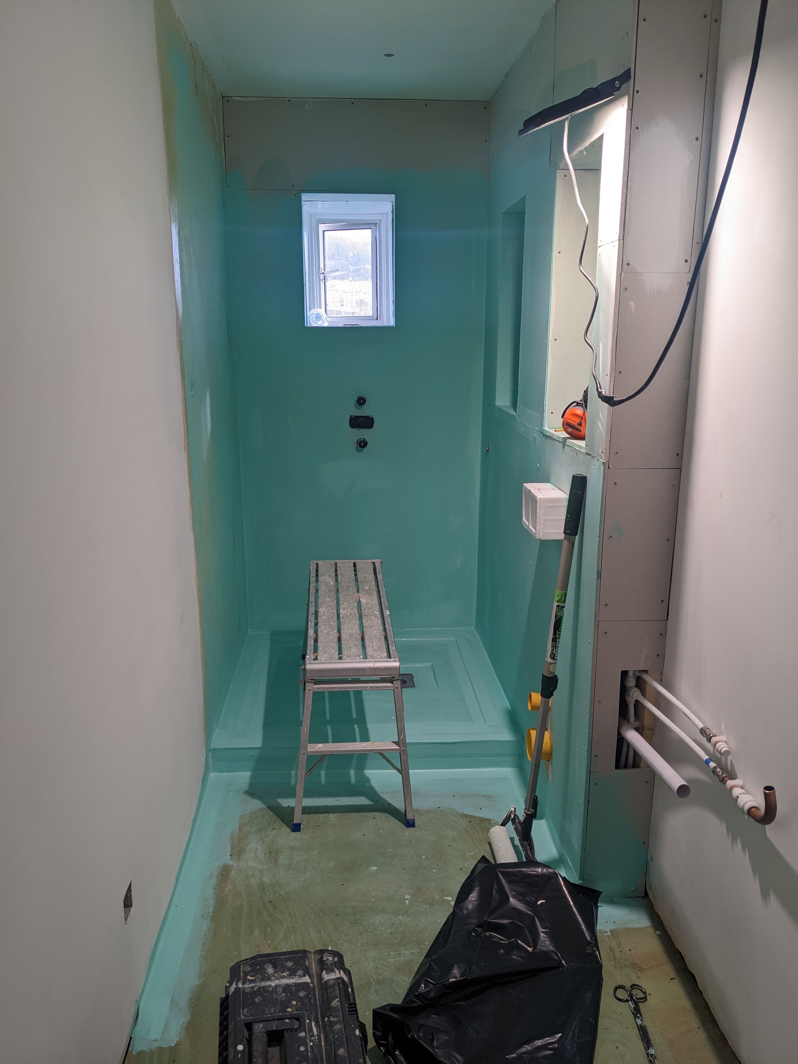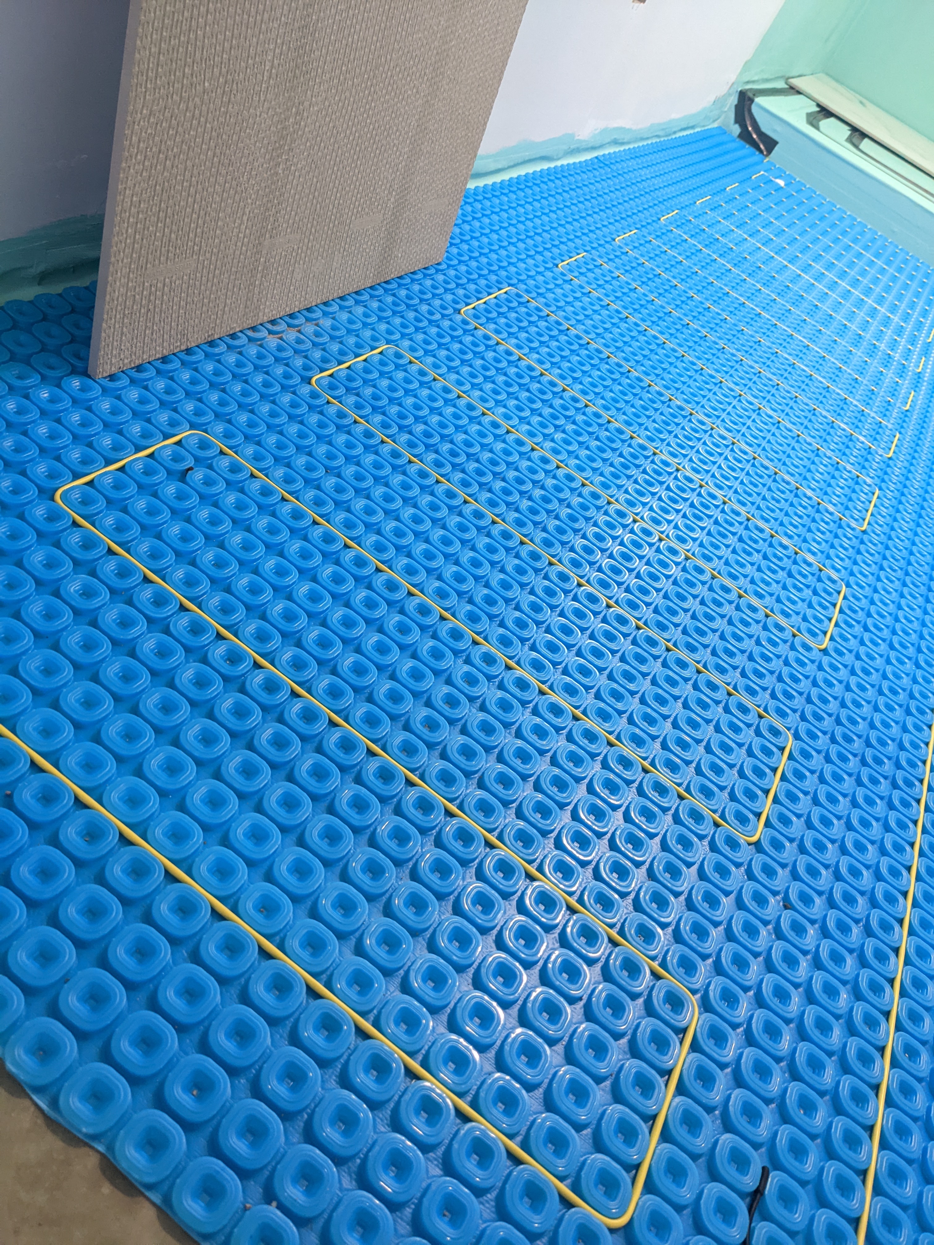 The bathroom is taking shape! Much of the work has been the same as when we had our master bathroom done. Studwork has been built, pipes installed, plasterboard put on top, mermaid-coloured waterproofing painted on, underfloor heating laid, then tiles being laid.