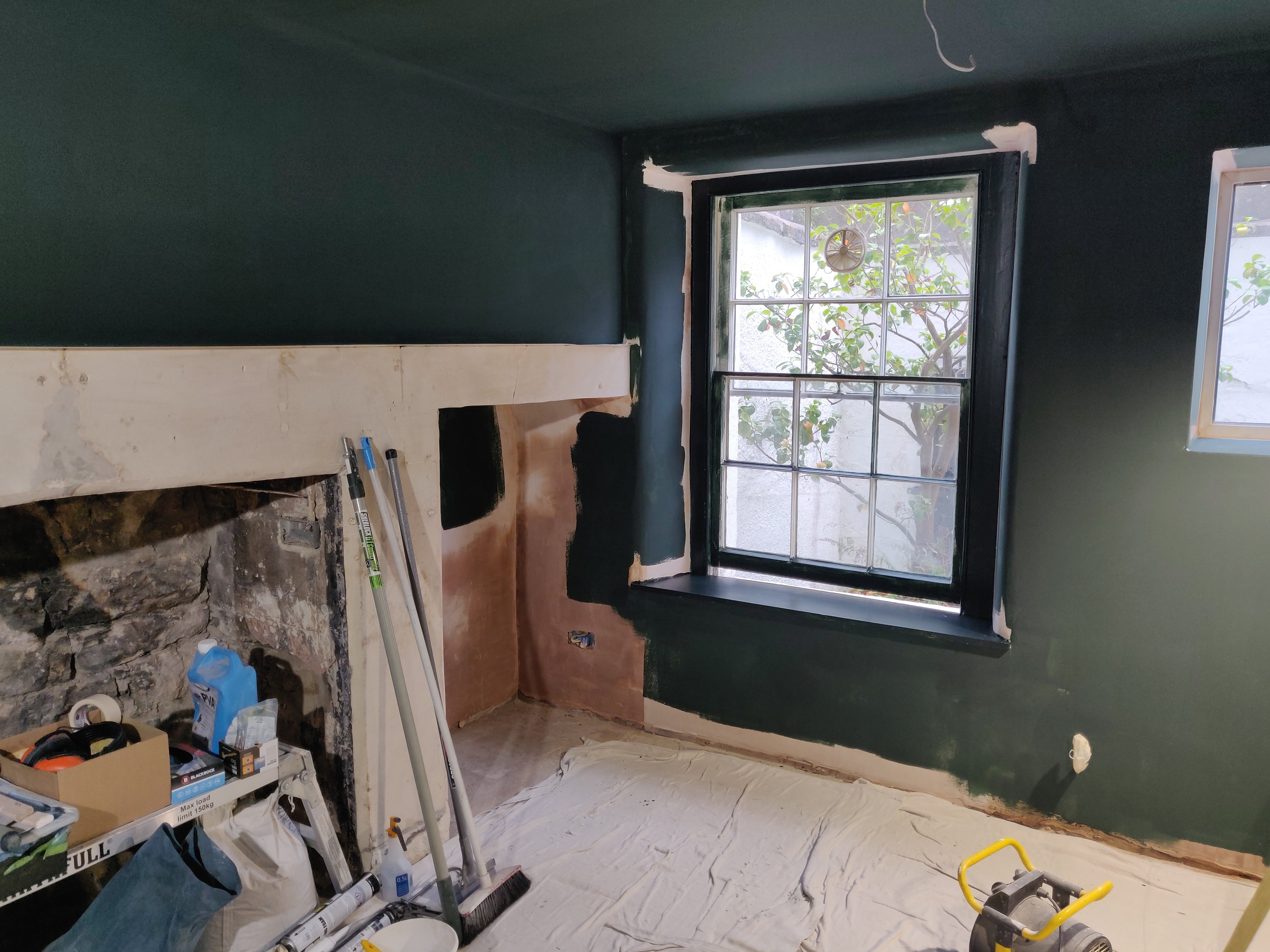 The dining room is now nearly complete. Since the last update, the plaster was painted, floor sealed and lights, ceiling speakers and radiators installed. There are a couple of finishing touches left to do, but essentially this room is done*.