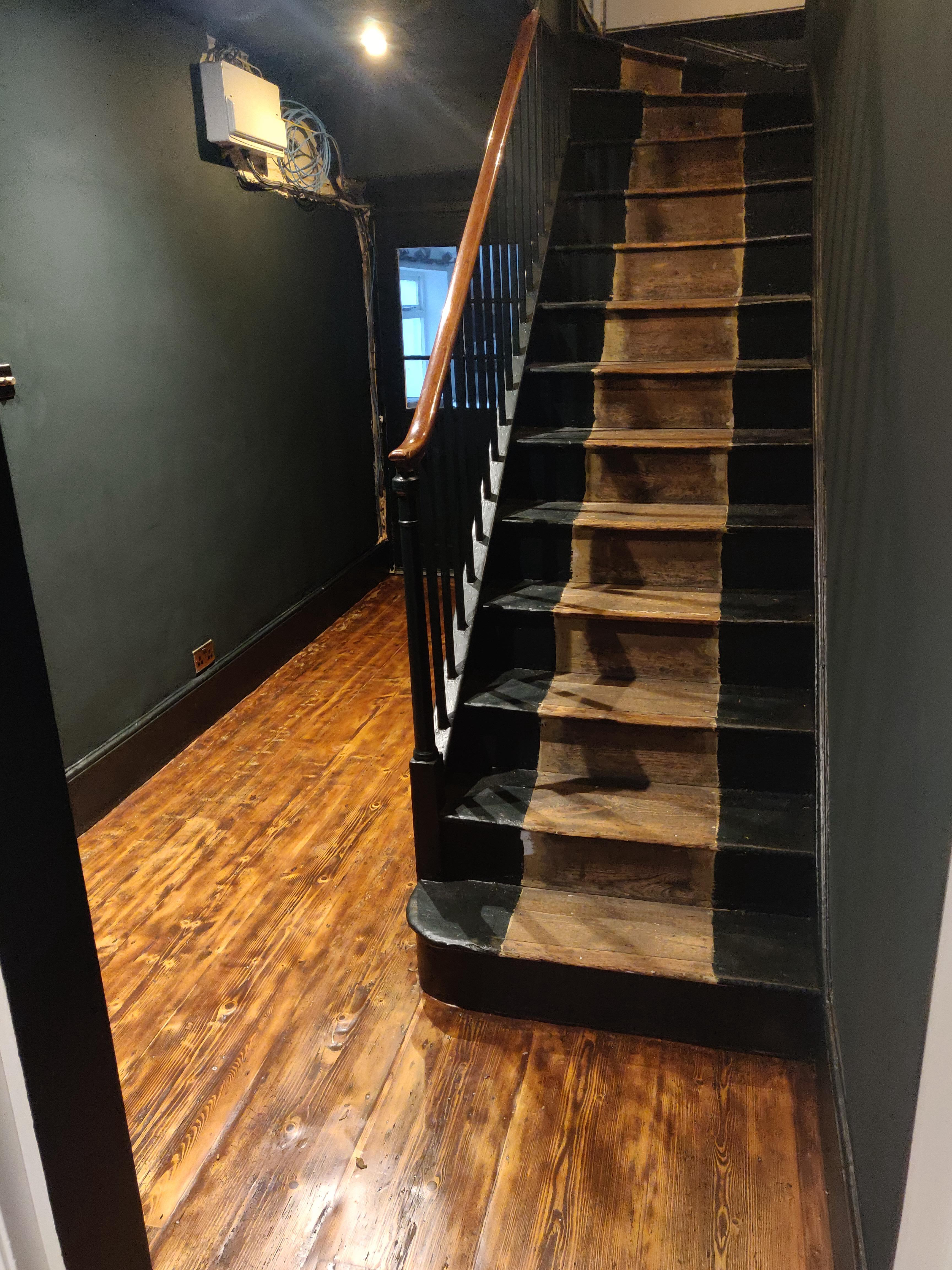 The floorboards in the hallway were in an okay state, and Simon and Will have done a great job of getting them mechanically secure and filling all the gaps.